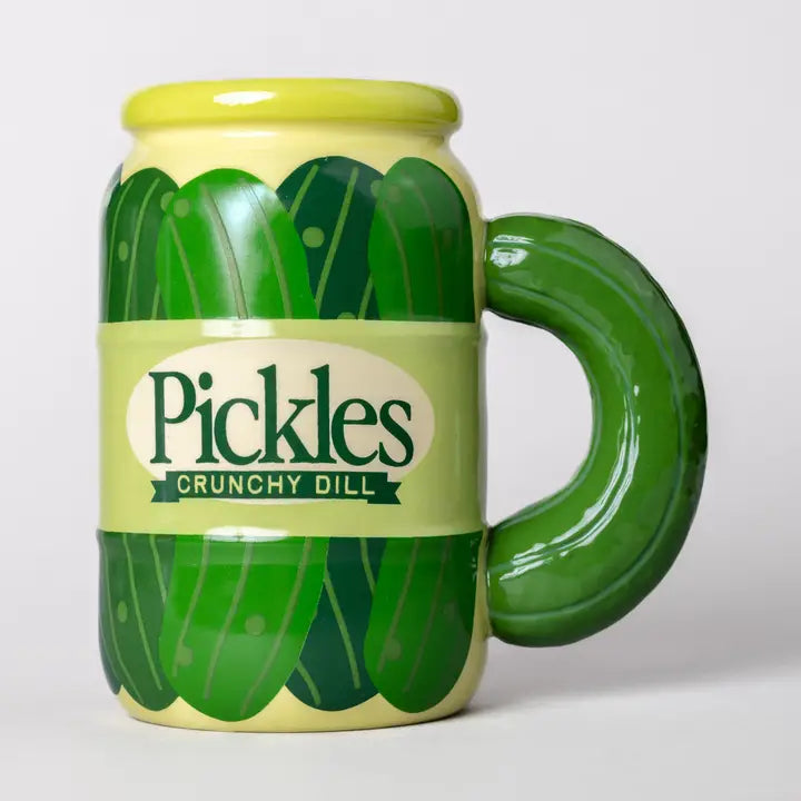 This quirky ceramic mug is molded to look like a classic pickle jar, handle and all, bringing a fun and playful vibe to your coffee or tea routine. Its vivid green finish and detailed ridges capture the charm of a real pickle, making it a delightful conversation starter or gift for anyone who loves unique kitchenware.