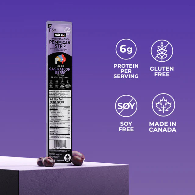 These delicious snacks are made REAL, all-natural BISON! The whole food ingredients are simple: Bison, Saskatoon berries, Pure Maple Syrup, Sea Salt, Pepper and Smoke. That’s it!